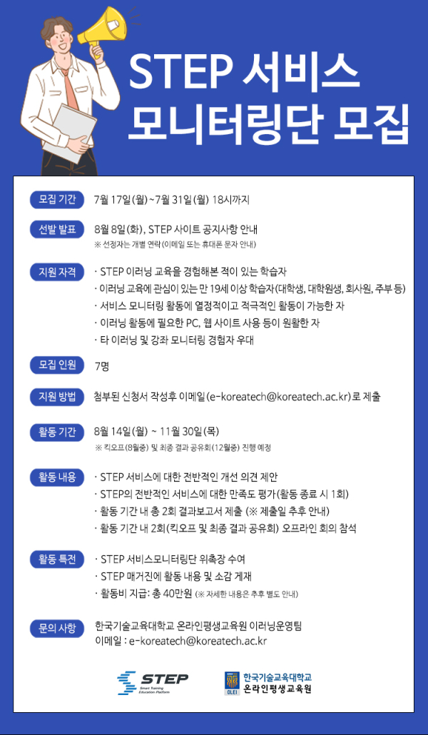 이러닝 교육을 경험해 본 적이 있거나 관심 있는 만 19세 이상 학습자(대학생, 회사원, 주부 등)는 누구나 지원할 수 있으며, STEP 공고문을 참고해 신청서 작성 후 이메일로 오는 31일까지 접수하면 된다.