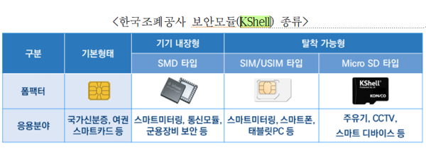 조폐공사의 보안모듈 ‘KShell’은 2015년 주유량 조작을 원천적으로 봉쇄하는 주유기 전자봉인 보안모듈 적용을 시작으로, 한국전력의 지능형 전력망(AMI, Advanced Metering Infrastructure), 스마트 가로등, 항공장애표시등, CCTV 등 다양한 IoT 기기에서 안전하게 데이터를 관리, 보호하고 있다. 최근에는 보안모듈을 적용한 디지털기기의 적합 여부와 운영데이터의 무결성을 확인해주는 통합운영솔루션 서비스까지 제공하고 있다.