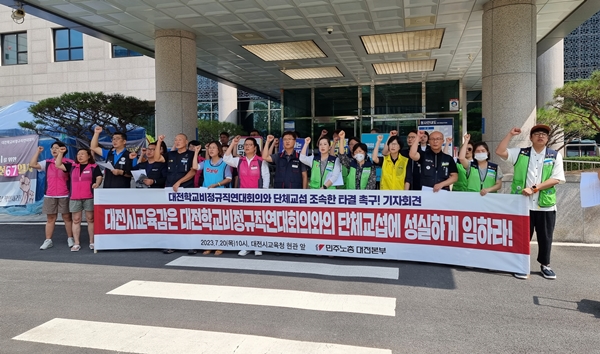 [충청뉴스 이성현 기자] 민주노총 대전본부가 “대전교육청은 학비노조와의 단체교섭에 성실히 임하라”라며 지원사격에 나섰다.