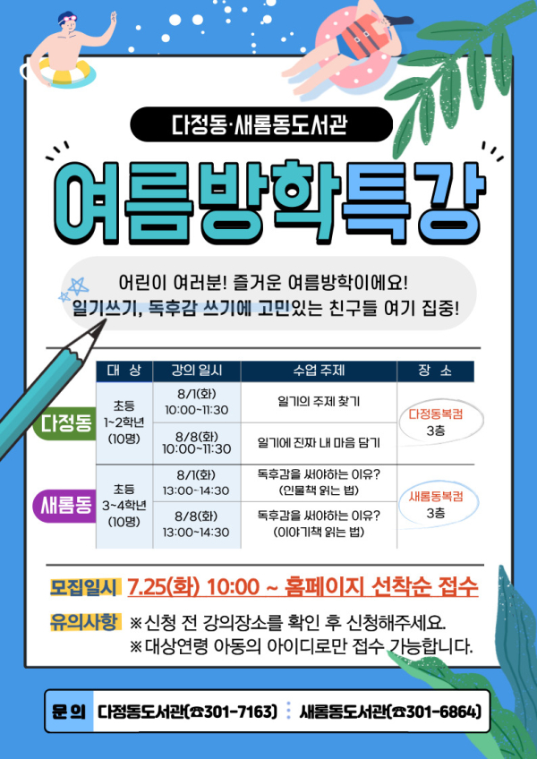 ‘마음을 담은 일기 쓰기’는 8월 1~8일 매주 화요일 오전 10시부터 11시 30분까지 다정동 도서관에서 진행하며, ‘의미를 담은 독후감 쓰기’는 같은 기간 13시부터 14시 30분까지 새롬동도서관에서 진행한다.