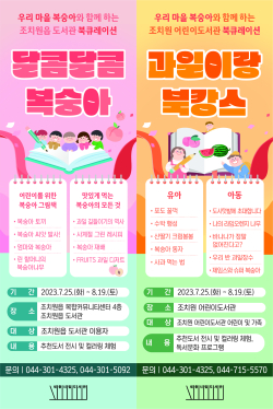 조치원읍 도서관에서는 ‘달콤달콤 복숭아’를 주제로 어린이를 위한 복숭아 그림책 4권과 맛있게 먹는 복숭아의 모든 것 4권 등 추천도서를 선정하고 독후활동을 제공한다.
