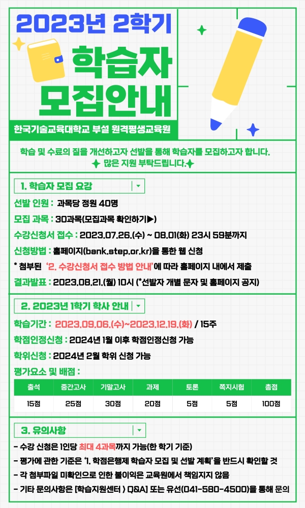 [충청뉴스 박동혁 기자] 한국기술교육대학교 부설 원격평생교육원은 2023학년도 2학기 학점은행제 학습자(약 1,200명)를 모집한다고 25일 밝혔다.