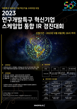 [충청뉴스 이성현 기자] 연구개발특구진흥재단은 오는 10월 대덕특구 50주년을 기념해 '2023 연구개발특구 혁신기업 스케일업 통합 IR 경진대회'를 개최하고 내달 8일까지 참가할 기업을 모집한다고 25일 밝혔다.