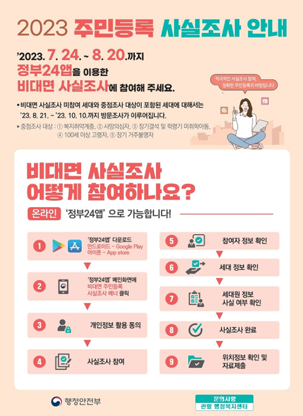 26일 시에 따르면 이번 사실조사는 정부24 앱을 통한 비대면-디지털 조사(7월 24일∼8월 20일) 진행 이후, 이·통장 및 읍·면·동 공무원이 거주지에 방문해 확인하는 방식으로 조사(8월 21일∼10월 10일)가 진행된다.
