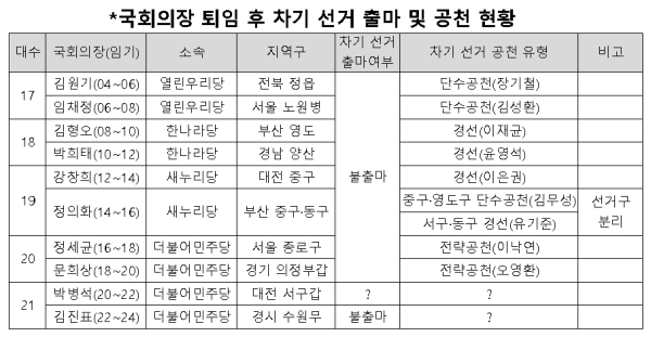 실제 지난 17대 전·후반기 국회의장을 차지한 열린우리당(더불어민주당 전신)은 18대 총선에서 국회의장 지역구 두 곳을 단수공천했다. 이후 20대 전·후반기 국회의장 지역구 두 곳 모두 21대 총선에서 전략공천을 단행했다.
