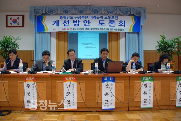 충남도의회 임춘근 도의원과 민주노총충남본부는 15일 충남도청에서 비정규직과 관계공무원 등 100여명의 인사들이 참여한 가운데 ‘충청남도 공공부문 비정규직 고용개선 토론회’를 개최했다.