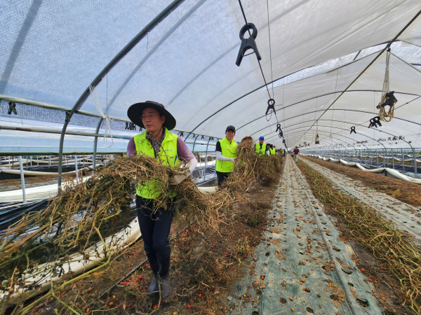 부여군 규암면에서는 이석용 농협은행장과 본점 임직원 90여 명이 참여해 수해로 손해를 입은 방울토마토 하우스를 복구했다.