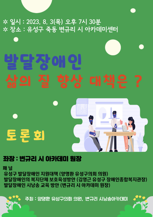 '발달장애인 삶의 질 향상 대책'을 위한 토론회에서는 변규리 시아카데미원장이 좌장을 맡고,패널로는 양명환 유성구의원은 '유성구 발달장애인 지원대책', 김영근 관장은 '발달장애인의 복지단체 보호 육성방안', 변규리 원장은 '발달장애인 시낭송 교육방안'을 발표할 예정이다.