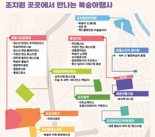 이외에도 세종 거리예술가와 함께하는 세종컬처로드, 왕의 빵 판매, 백드롭 페인팅 미술 놀이터, 20여 개의 연계 프로그램이 조치원 곳곳에서 축제를 이어간다.