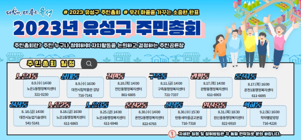 [충청뉴스 김남숙 기자] 대전 유성구(구청장 정용래)는 주민참여예산 사업선정을 위한 13개 동 주민총회를 8월 9일부터 9월 2일까지 개최한다고 밝혔다.