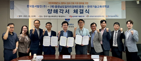 [충청뉴스 박동혁 기자] 한국기술교육대학교(이하 한기대)는 3일 제2캠퍼스에서 한국동서발전(주), 충남일자리경제진흥원과 석탄화력발전소 협력사 노동자들을 위한 ‘업의 전환 지원 협력’ 업무협약을 체결했다고 밝혔다.