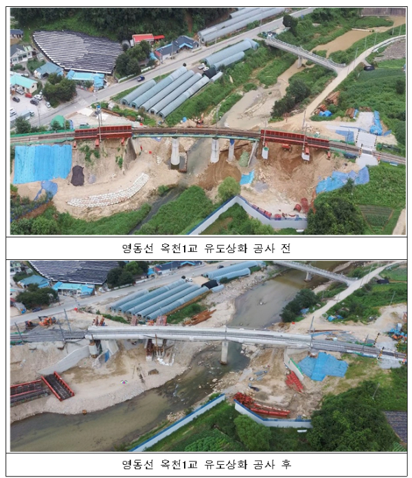 강원본부는 지난 2020년부터 총사업비 1,649억 원을 투입하여 교체가 시급한 영동선과 태백선 19개 교량의 유도상화 공사를 시행하고 있으며 작년 3개 교량의 유도상화를 완료한데 이어 올해 영동선 옥천1교를 포함하여 5개 교량의 시공을 완료하여 19개 교량 중 8개 교량 유도상화 공사를 완료하였다.