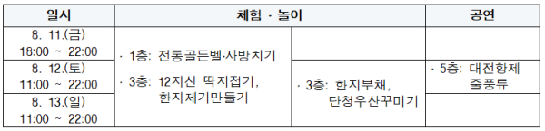 이번 행사는 대전 0시 축제가 시작되는 8월 11일부터 13일까지 3일 동안 부채․단청우산 꾸미기, 여러 가지 색감의 한지를 활용한 제기 만들기, 나의 띠를 찾아 꾸며보는 12지신 딱지 만들기, 전통놀이, 전통골든벨 등 다양한 시민 참여 프로그램으로 구성되어 있다.