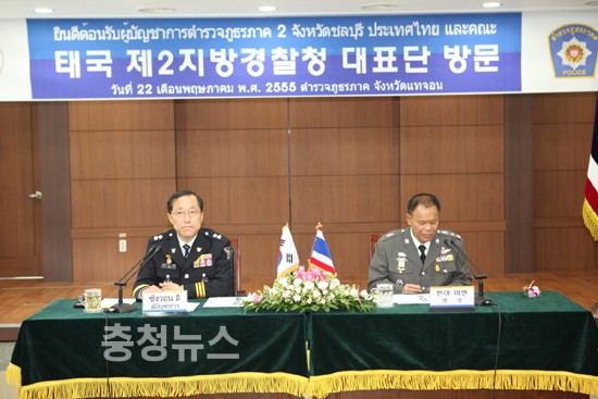 대전지방경찰청 (청장 이상원)은 오는 22일 10시 태국 제2지방경찰청 대표단(빤야 마멘 청장 등 9명)이 대전 ·태국·촌부리 등 지역의 양 청간 치안협력 강화 방안을 논의하고자 대전지방경찰청을 방문하여 6층 대회의실에서 회의를 하였다.