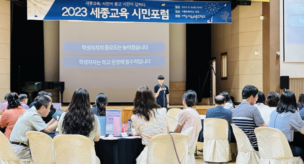 [충청뉴스 최형순 기자] 세종마을교육연구소(소장 유우석 해밀초 교장)가 주관한 ‘2023 세종교육 시민포럼’(이하 포럼)이 19일 약 100여 명의 세종시민들이 참여하여 아름 초등학교 강당에서 개최되었다.