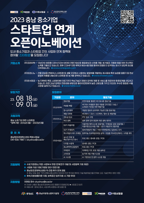 [충청뉴스 박동혁 기자] 충남창조경제혁신센터(이하 충남창경센터)는 '2023년 충남 중소기업-스타트업 연계 오픈 이노베이션'에 참여할 유망 스타트업을 추가로 모집한다고 20일 밝혔다.