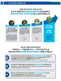 이번 사업은 개인 연구자들의 아이디어로부터 시작해 과제 기획연구, 개념검증연구, 본격적인 전문연구로 연결·성장시키는 것을 목표로 하는 ‘ETRI 연계형 창의도전 이음투자’ 사업의 일환으로 ETRI에선 처음 시도하는 사업이다.