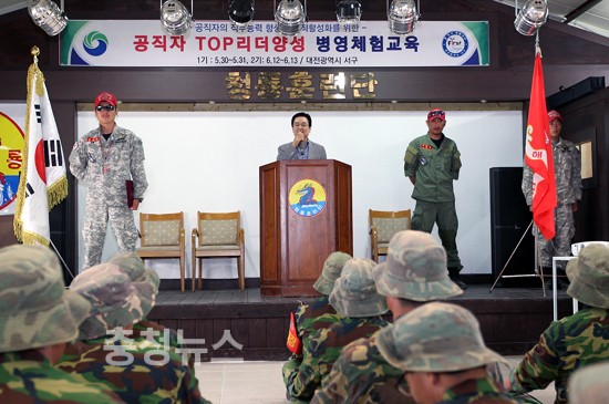 대전광역시 서구(구청장 박환용)는 공무원들의 리더십 배양과 조직의 활 성화를 도모코자 간부공무원을 대상으로 지난 30일부터 경기도 안산 청룡 훈련단에서 '공직자 TOP리더 양성 병영체험 교육' 입소식을 갖고 1박 2일간 훈련을 들어갔다.