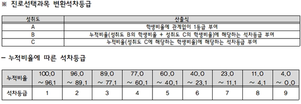 진로선택과목 변환석차등급 및 누적비율에 따른 석차등급