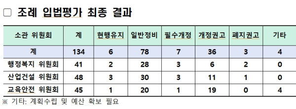 이날 세종시의회는 최종보고회에서 134건(시청 105건, 교육청 29건)의 평가조례를 대상으로 ▲일반정비 78건, ▲필수 개정 7건, ▲개정 권고 36건, ▲폐지 권고 3건, ▲기타 4건의 정비의견을 제시하였다.