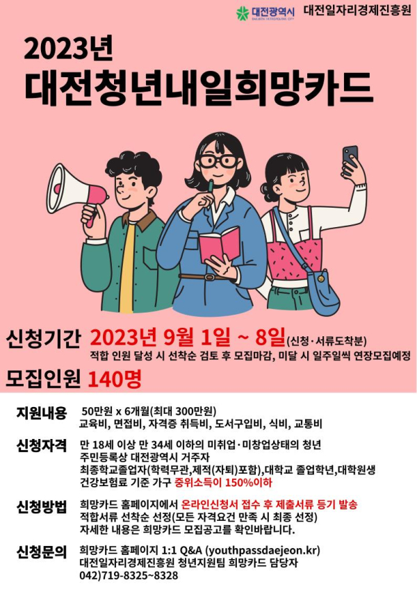 보다 자세한 사항은 대전시청 또는 청년내일희망카드 홈페이지(www.youthpassdaejeon.kr)에 게시된 공고문을 통해 확인할 수 있으며, 궁금한 사항은 대전일자리경제진흥원 청년지원팀(042-719-8325~8328)으로 문의하면 된다.