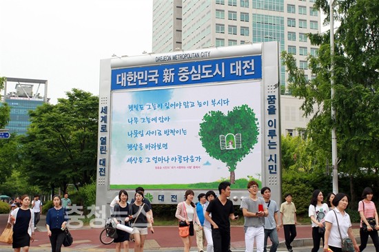 대전시 관계자는 “대전사랑 글 마당은 계절별로 시민공모를 통해 게시함으로써 시민들에게 따스한 감성을 전해줘 큰 호응을 얻고 있다”며“글귀를 통해 잠시나마 생활의 여유로움을 찾고 문화욕구도 충족할 수 있는 기회를 가졌으면 하는 바람”이라고 밝혔다.