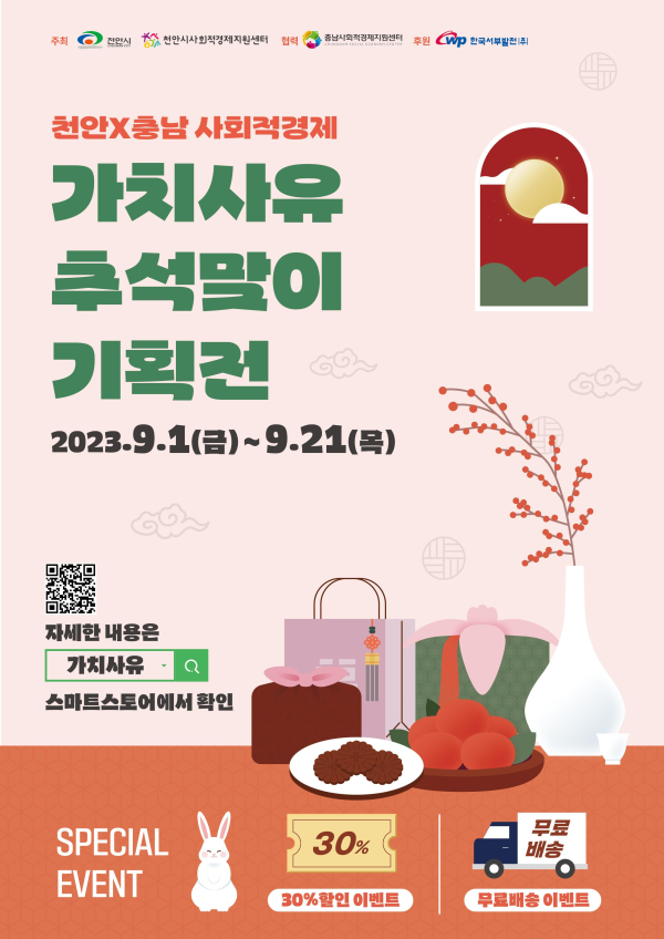 [충청뉴스 박동혁 기자] 천안시사회적경제지원센터는 오는 21일까지 공식 온라인쇼핑몰 ‘가치사유’에서 추석맞이 특별기획전을 진행한다고 4일 밝혔다.