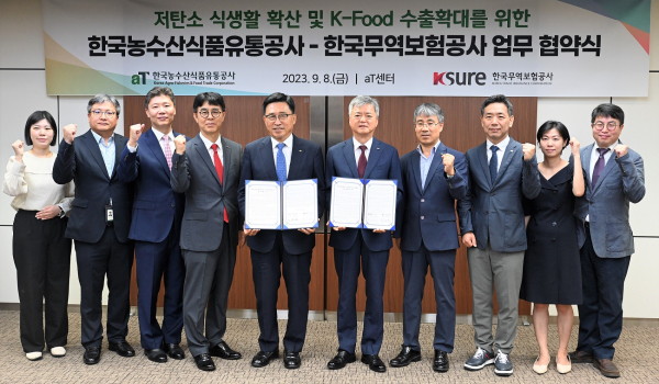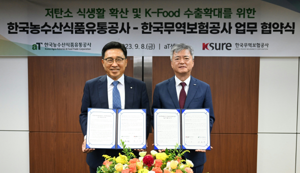 [충청뉴스 최형순 기자] 한국농수산식품유통공사(사장 김춘진)와 한국무역보험공사(사장 이인호)는 8일 서울 양재동 aT센터에서 저탄소 식생활 확산과 K-푸드 수출 확대를 위한 업무협약을 체결했다.