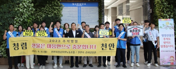 [충청뉴스 박동혁 기자] 천안시청공무원노동조합은 11일 추석 명절을 앞두고 노사가 함께하는 ‘명절선물 안 주고 안 받기’ 청렴 캠페인을 실시했다.