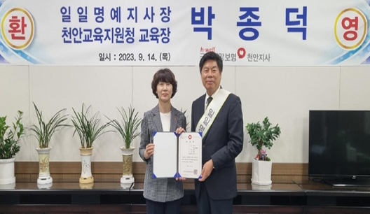 [충청뉴스 박동혁 기자] 국민건강보험공단 천안지사는 14일 박종덕 천안교육지원청 교육장을 일일명예지사장으로 위촉했다고 밝혔다.