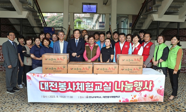 [충청뉴스 이성현 기자] 대전지역 봉사단체인 대전봉사체험교실이 추석 명절을 앞두고 한남대 용역직원들에게 사랑의 기부물품을 전달했다.