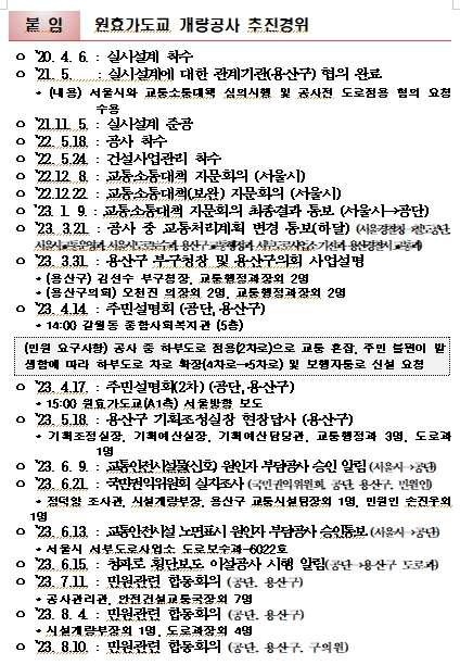 이후 "본 공사 실 착수 전 주민설명회(`23.4월)에서 원효가도교 하부도로 1개 차로와 통로박스 1개 증설 요구 민원이 제기되었고, 검토결과 도로확장과 보행자통로 신설은 도로법 적용 대상이고, 추가 비용이 수반되는 사항으로 관련 법상 공단 부담이 어려워 도로관리청인 용산구와 비용 문제를 협의 중"이라고 덧붙였다.