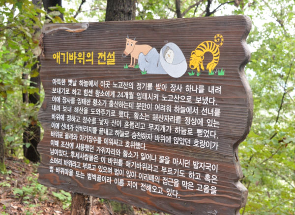 노고봉 정상에서 탁 트인 조망을 즐기고 하산한다. 하산하는 길에 봉화대 왼쪽으로 발길을 돌린다. 곧이어 만나는 갈림길에 애기바위 전설 안내판이 설치되어 있다. 애기바위에는 힘센 장사와 황소 사이에서 태어난 아기 장수 전설이 내려온다는 내용이다.