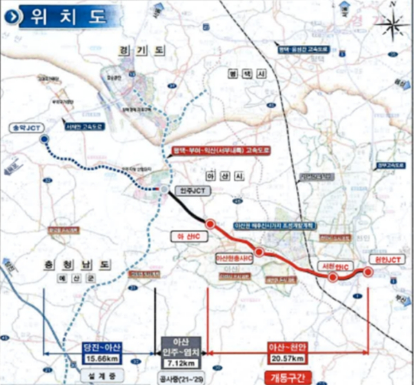 한편 아산-천안 고속도로는 내후년에 인주면, 2029년에는 당진 송악 분기점까지 연결할 계획이다.