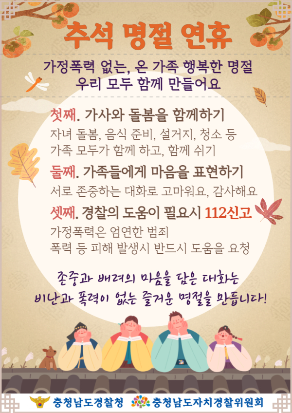 충남경찰 관계자는 “추석 명절 연휴 기간에 도민 모두가 행복하길 기원드리며, 가정폭력 신고에 대해 신속엄정하게 대응하여 충남지역에서 가정폭력이 증가하지 않도록 최선의 노력을 다하겠다”라고 밝혔다.