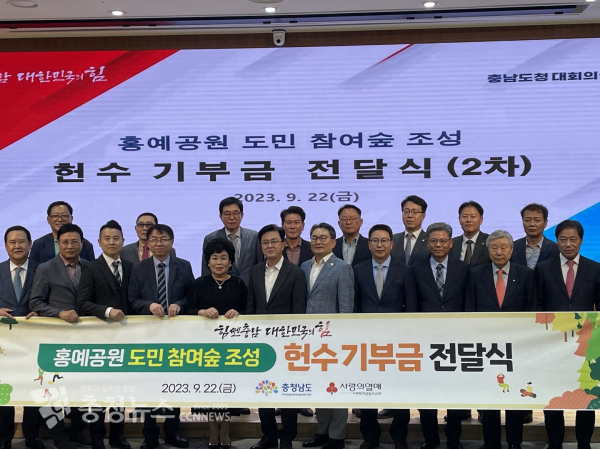 충남도는 이날 도청 대회의실에서 김태흠 지사와 정회영 사랑의열매 사무처장 등이 참석한 가운데, 도민 참여 숲 조성을 위해 헌수금을 기부한 20개 기업·단체와 전달식을 개최했다.