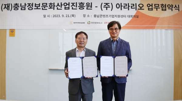 [충청뉴스 박동혁 기자] ㈜아라리오는 충남정보문화산업진흥원과 천안시민의 문화 향유 확대를 위해 업무협약을 체결했다고 22일 밝혔다.
