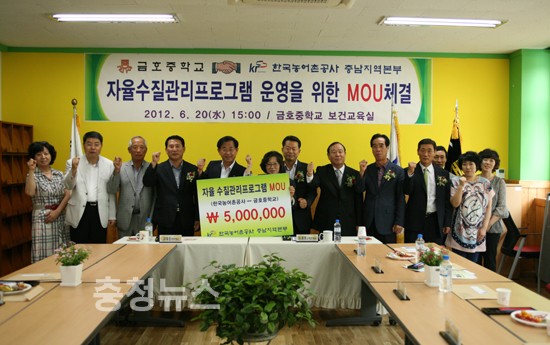 금호중학교(교장 임재희)는 20일 한국농어촌공사충남지역본부(본부장 김태웅)와 ‘자율수질관리프로그램 운영을 위한 양해각서(MOU)’를 체결하고 미래환경을 책임질 학생들의 환경교육과 실질적인 수질개선에 힘을 모으기로 했다.