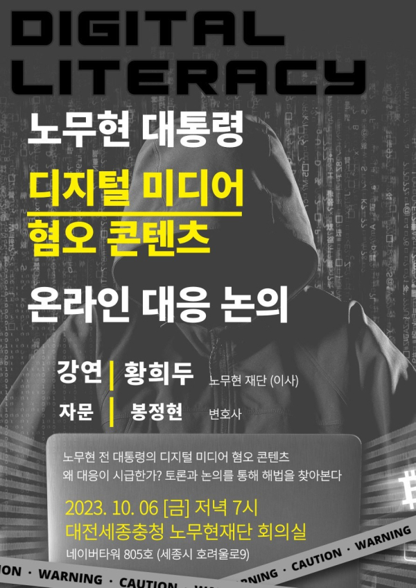 발제자로는 황희두 노무현재단 이사와 세종시에서 활동하는 봉정현 변호사가 나선다. 노무현 전대통령이 떠난 지 14년이 지났지만 표현의 자유를 내세우며 고인을 모독하고 폄훼하는 행위는 지속되고 있는 것에 문제의식을 느낀 세종청년들이 노무현재단과 함께 디지털 미디어 혐오 콘텐츠 대응에 대한 토론과 논의를 기획한 것이다.
