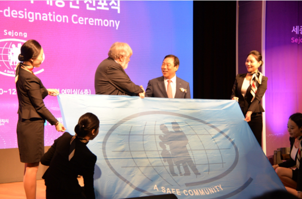 국제안전도시 재공인선포식 (왼쪽부터) 데일핸슨(전)국제안전도시공인센터의장, 최민호 세종시장(안전정책과)