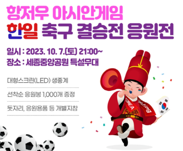 이번 응원전은 항저우 아시안게임 남자축구 결승전에 진출한 대한민국 대표팀을 응원하고, 세종시민이 함께 우승을 기원하기 위해 마련됐다.