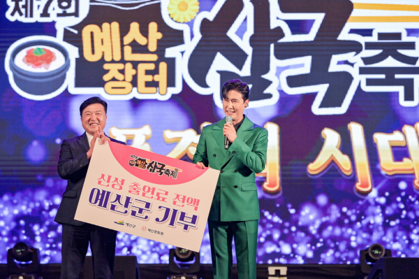 가수 신성은 고향사랑기부제를 통해 이번 축제 출연금 전액을 예산군에 기부해 고향사랑을 실천했다/(왼쪽부터 최재구 예산군수, 가수 신성)