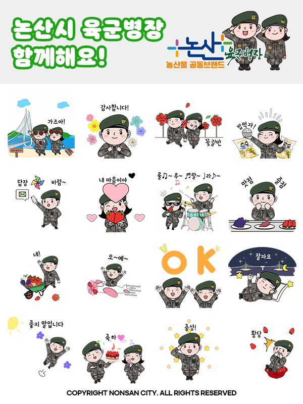 시는 지난 5월부터 육군병장을 테마로 한 이모티콘을 개발, 8월 중 시 홈페이지를 통해 총 50종의 이모티콘을 공개한 바 있다. 이모티콘은 감사, 행복, 축하 등 소셜 메신저 이용자들이 가장 즐겨 사용하는 내용들로 구성됐으며 논산딸기, 논산 쌀 등의 특산품은 물론 탑정호출렁다리, 탑정호의 야경 등 논산의 명품 볼거리 역시 이모티콘 이미지에 포함됐다.