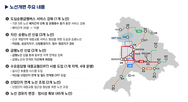 노선 개편안에는 ▲도심순환 급행버스 서비스 강화 ▲지선·순환노선 신설 ▲급행노선 신설 및 수요응답형 버스(DRT:천안콜버스) 시범 도입 등의 내용이 담겼다.