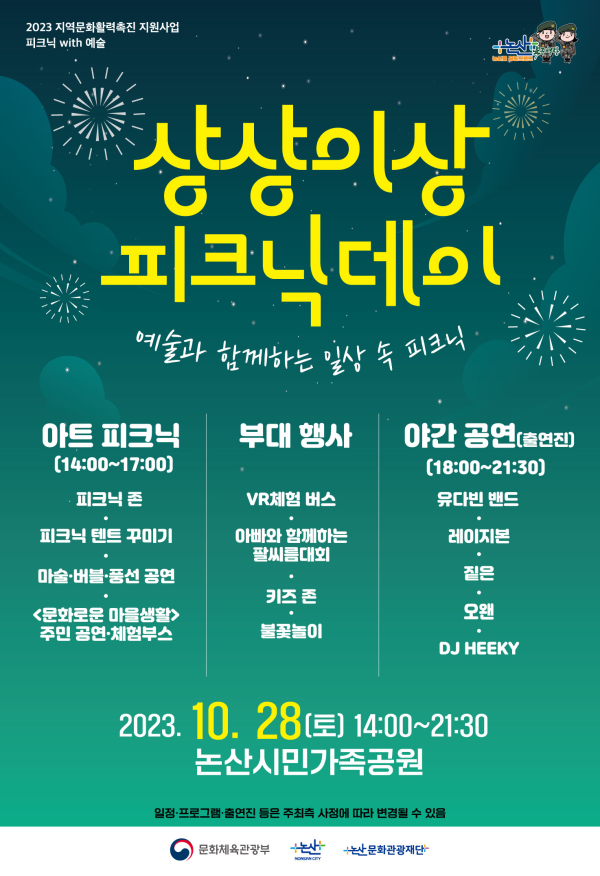 [충청뉴스 논산 = 조홍기 기자] 논산문화관광재단(대표이사 지진호)이 오는 28일 논산시민가족공원에서 시민과 마을활동가가 함께 ‘예술문화’를 즐기는 <피크닉 with 예술>-‘상상이상 피크닉데이’를 개최한다.