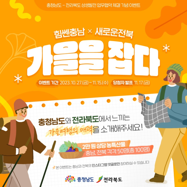 ‘힘쎈충남×새로운전북, 가을을 잡다’를 주제로 기획한 이번 이벤트는 27일부터 다음달 15일까지 양 지자체의 공식 인스타그램 계정(충남도 @chungnam_official, 전북도 @jeonbukstar)에서 동시 진행한다.