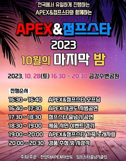 [충청뉴스 최형순 기자] 한양대 APEX 태권도 점프스타 줄넘기 클럽은 28일 오후 4시 30분 세종 금강 수변공원에서 세종시민들과 함께하는 ‘2023년 APEX&점프스타 10월의 마지막 밤’ 공연을 개최한다.