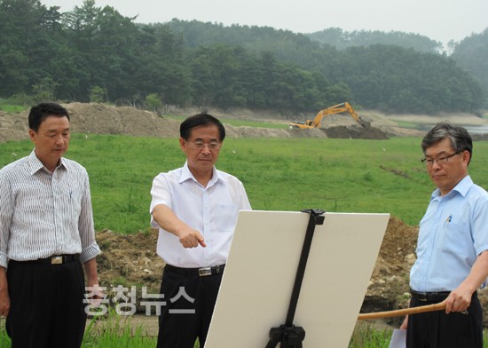▲ 한국농어촌公 김태웅본부장(가운데)은 천안시 성남면 대정저수지 준설현장을 방문 풍수해 대책을 점검하고 있다.