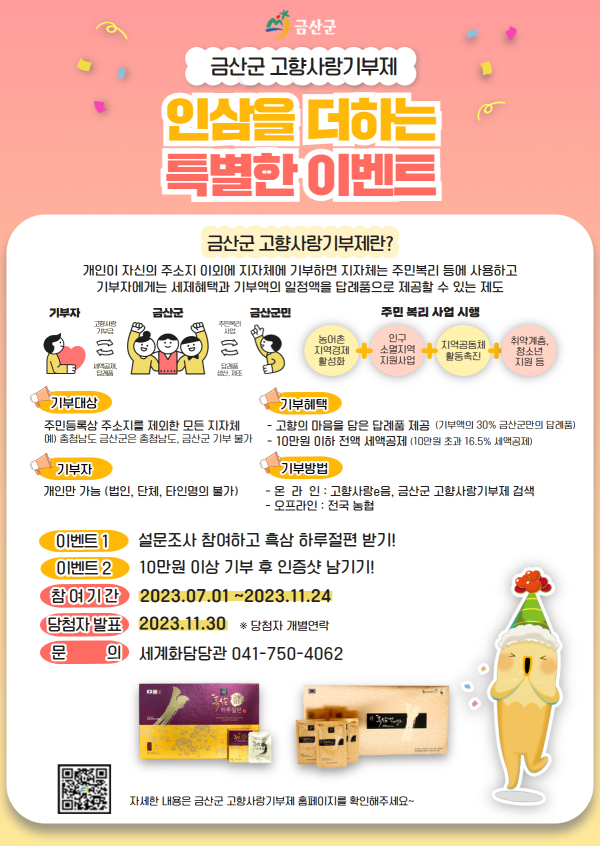 고향사랑기부제에 관한 자세한 내용은 전용 홈페이지(https://geumsanlove.kr/)를 방문하거나 금산군청 세계화정책팀(☎041-750-4062)에 문의하면 된다.