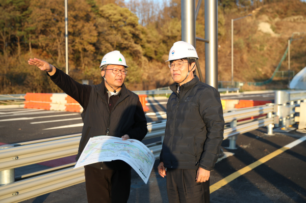 김형렬 행복청장(오른쪽)이 21일(화) 개통이 임박한 5생활권 외곽순환도로 현장을 찾아 현황 및 이용자 편의사항을 점검하고 있다.